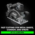 Power through a variety of metal including sheets, conduit, and struts with up to 4,500 RPM using the FLEX 24V 5-7/8” Metal Cutting Circular Saw. This cordless metal cutting circular saw features a high-efficiency chip collection system that captures metal shards with an easily removable disposal box for maximum productivity. The metal cutting saw has a clear viewing window to maintain visibility to your cut line while blocking flying chips as you cut. The metal cutting saw includes a 5-7/8” 36-tooth ceramic carbide metal cutting circular saw blade built with an ACFR tooth design and thin kerf for demanding metal cutting applications. A removable auxiliary handle adds stability for two-handed operation while punched steel shoe ensures added durability with its 2-1/4-inch cut capacity. A rafter hook allows easy storage between cuts. This battery-powered metal cutting circular saw delivers the FLEX Advantage of unmatched battery power, runtime, and fast charging (batteries and chargers sold separately). It’s all protected by the FLEX Limited Lifetime Warranty when registered within 30 days of purchase at registermyFLEX.com through December 31, 2025.