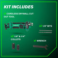The unique soft start feature reduces start up recoil and enhances safety. The compact design features low vibration and is easy to grip for added comfort. The built-in LED light illuminates dark work areas. This 18V Drywall Cut Out Tool offers flexibility with a tool-less base change, two (1/8" and 1/4") interchangeable collets, and an integrated belt hook.