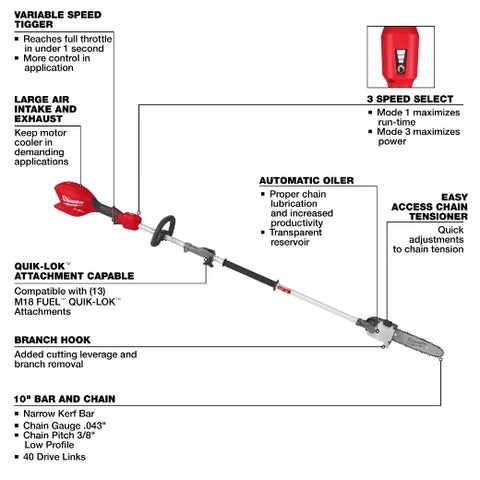 Milwaukee 3016-20PS M18 FUEL™ Pole Saw w/ QUIK-LOK™ Designed to meet the needs of landscape maintenance professionals, our M18 FUEL™ 10” Pole Saw w/ QUIK-LOK™ provides you with more power...